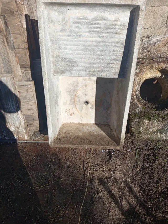 Pila de lavar antigua de cemento, ideal para exteriores o espacios rústicos. - Material: Cemento. - Diseño con superficie rugosa para frotar. - Desagüe central.