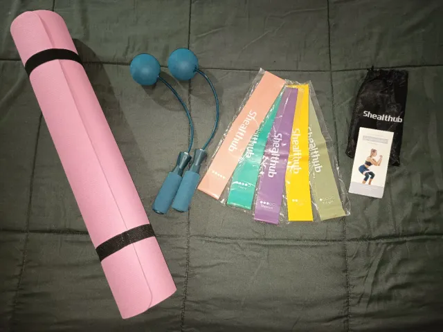 Alfombra para entrenar o pilates (10€) Elásticos sin estrenar (5€) Y comba inalambrica (10€)