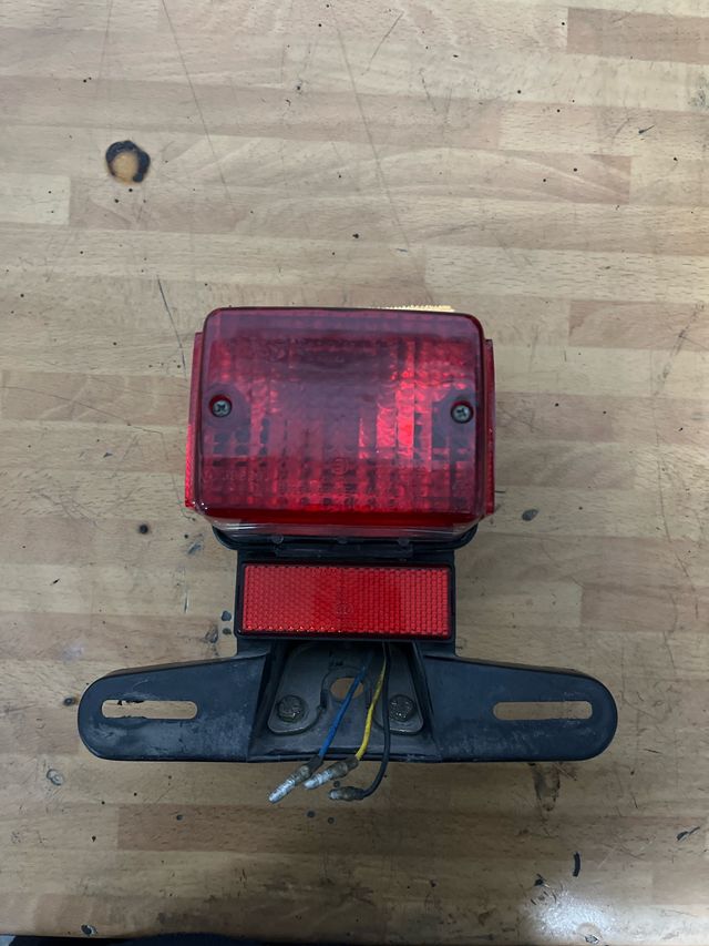 Piloto trasero/ portamatrícula para Yamaha SR 125 y SR 250. Incluye reflector. - Lente roja. - Soporte negro. - Cables de conexión.