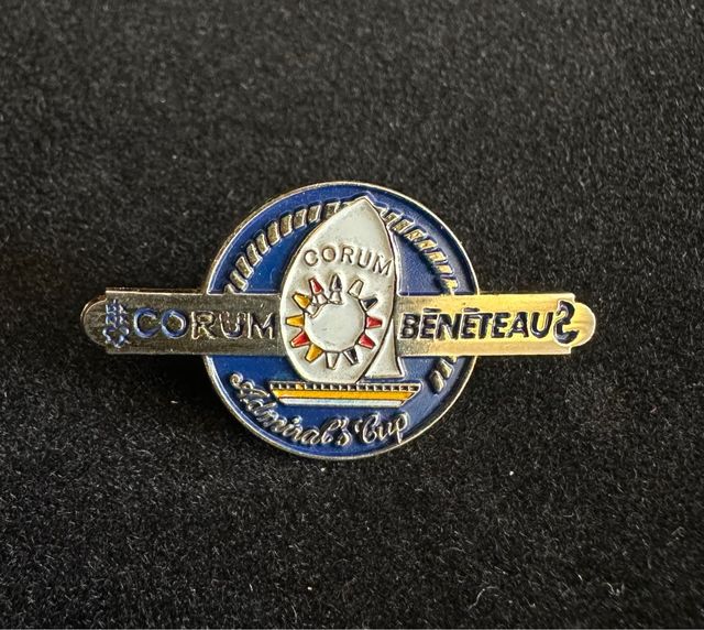 Detalles del productoPin conmemorativo de la regata Admiral's Cup, con diseño de vela y los logotipos de Corum y Beneteau.