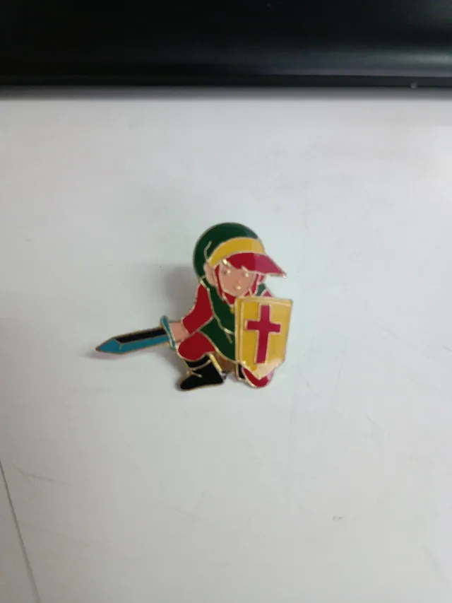 Pin coleccionable del personaje Link de The Legend of Zelda. - Diseño detallado con espada y escudo. - Colores vivos: verde, rojo y amarillo.