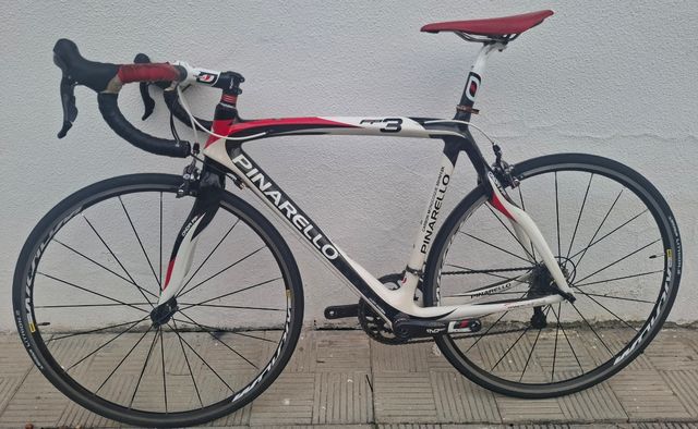 Detalles del productoBicicleta de carretera Pinarello FP3 en color blanco, negro y rojo. Equipada con componentes Shimano Ultegra y ruedas Mavic.