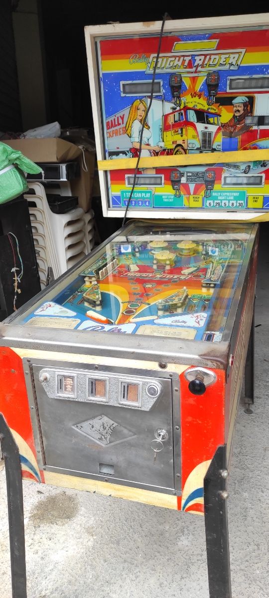 Máquina de pinball Bally Night Rider. - Diseño temático de camiones y carretera. - Panel de control con ranuras para monedas y botones.