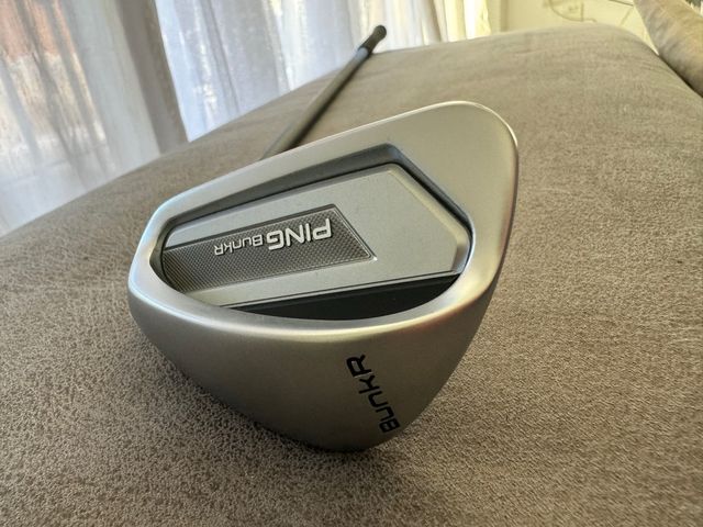 Este es un palo de golf Ping Bunkr. - Diseño plateado. - Inscripción PING BUNKR en la parte frontal. - Inscripción BUNKR en la parte inferior.