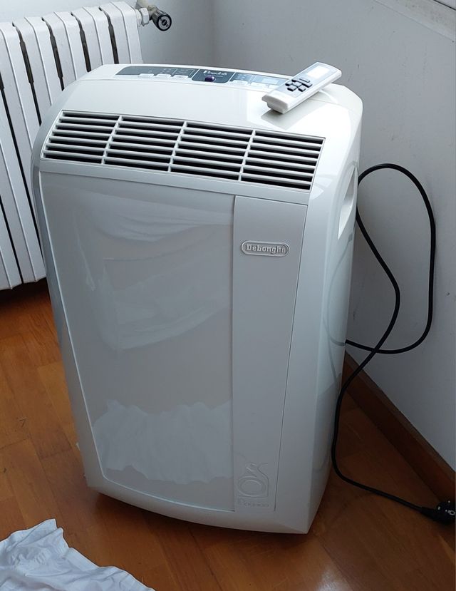 Detalles del productoSe vende aire acondicionado portátil De'Longhi Pinguino PAC N90Eco Silent. Está en buen estado y funciona perfectamente. Muy poco uso. Se incluye tela de nylon aislante para poner con velcro en la ventana. Vendo por mudanza