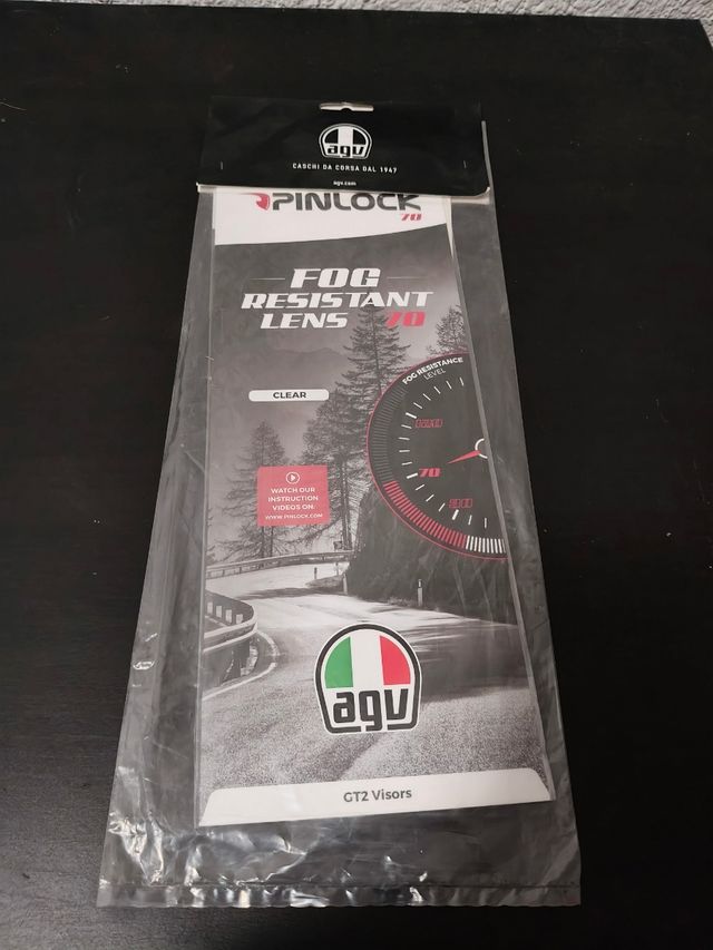 Visor Pinlock 70 para cascos AGV. - Modelo: Pinlock 70. - Color: Transparente (Clear). - Nivel de resistencia al empañamiento: 70. - Compatible con visores GT2.