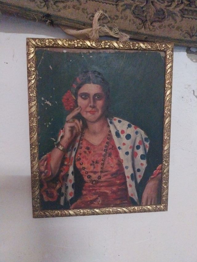 Pintura al óleo antigua flamenca y vestido andaluz