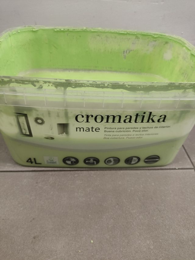 Detalles del productoPintura plástica Cromatika mate para paredes y techos de interior. Es de color verde claro y tiene un acabado mate.
