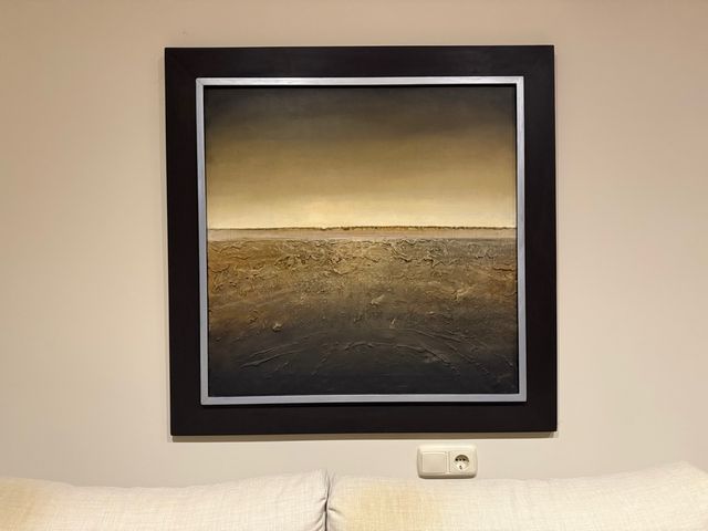 Obra de arte original del artista Juan Roldán. - Lienzo con textura y relieve. - Tonos tierra y oscuros predominantes. - Marco oscuro con detalle plateado.