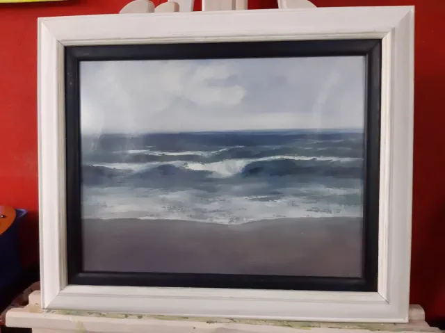 Pintura original de un paisaje marino con olas rompiendo en la orilla. La obra está enmarcada. - Lienzo con escena de mar y cielo. - Marco blanco con interior negro.