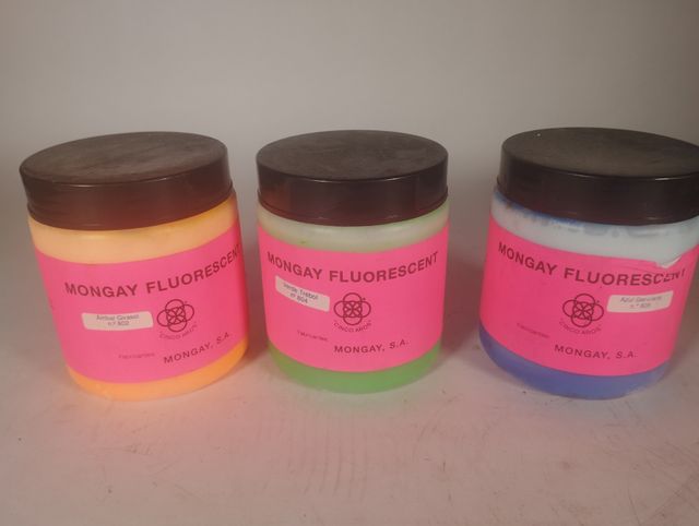 3 Botes de pintura fluorescente al agua. De CincoAros. Botes de 750 ml. Verde trébol, ámbar o azul. Precio por 3 unidades, una de cada color