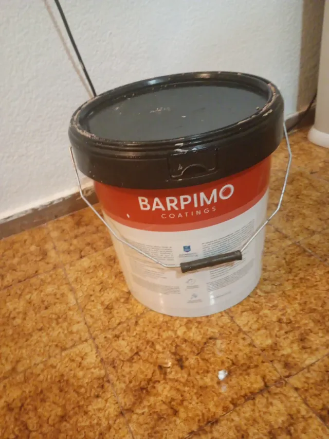 Contenedor de pintura impermeabilizante de la marca BARPIMO. - Color rojo - Tapa negra. - Asa metálica para transporte.