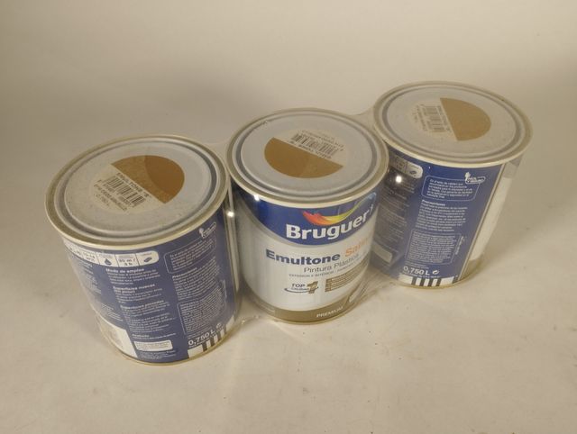 Tres botes de pintura plástica Bruger emultone satinado. Color oxido amarillo, botes de 0,750 l.