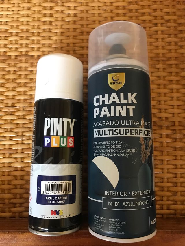 Detalles del productoDos botes de pintura en spray azul. Uno es Pinty Plus Azul Zafiro y el otro es SPSIL Chalk Paint Azul Noche. Ambos sin usar y en perfecto estado.