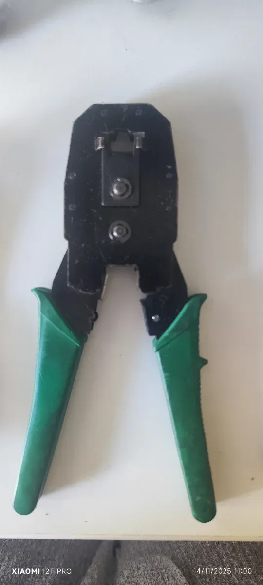 Herramienta para crimpar conectores de red. - Mango ergonómico de color verde. - Cuerpo principal de metal negro.