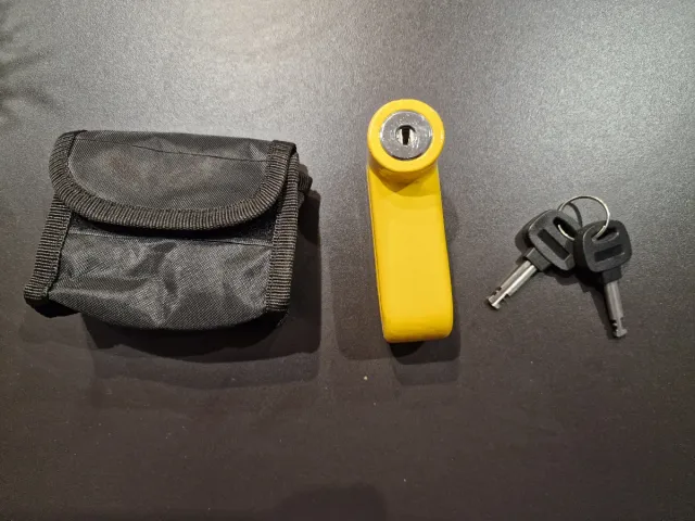 Pinza antirrobo disco para moto de color amarillo - Mecanismo de bloqueo con llave. - Incluye dos llaves. - Funda de tela negra para guardarla.