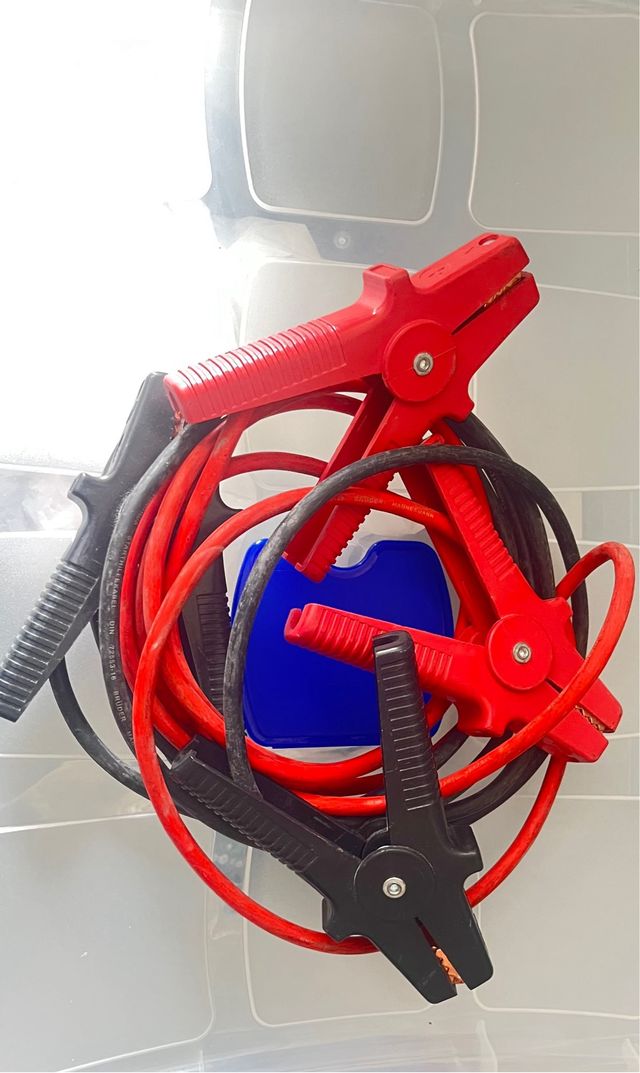 Pinzas para batería de coche, ideales para arrancar un vehículo. - Pinzas de color rojo y negro. - Cables de conexión para batería.