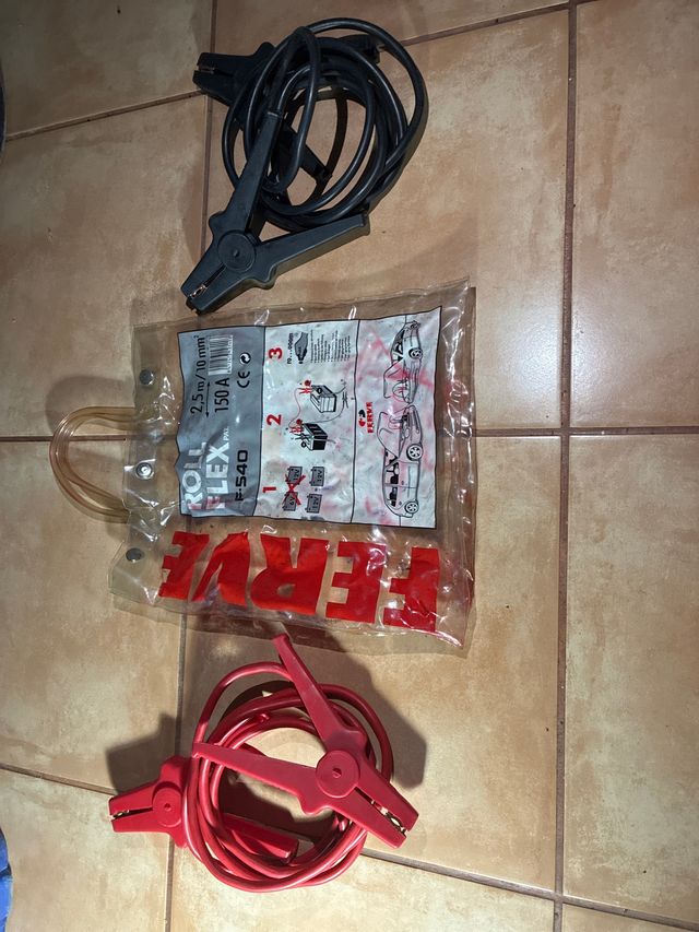 Pinzas de arranque para batería de coche, marca FERVE. - Longitud del cable: 2,5 metros. - Sección del cable: 10 mm². - Intensidad máxima: 150 A. - Modelo Roll Flex.