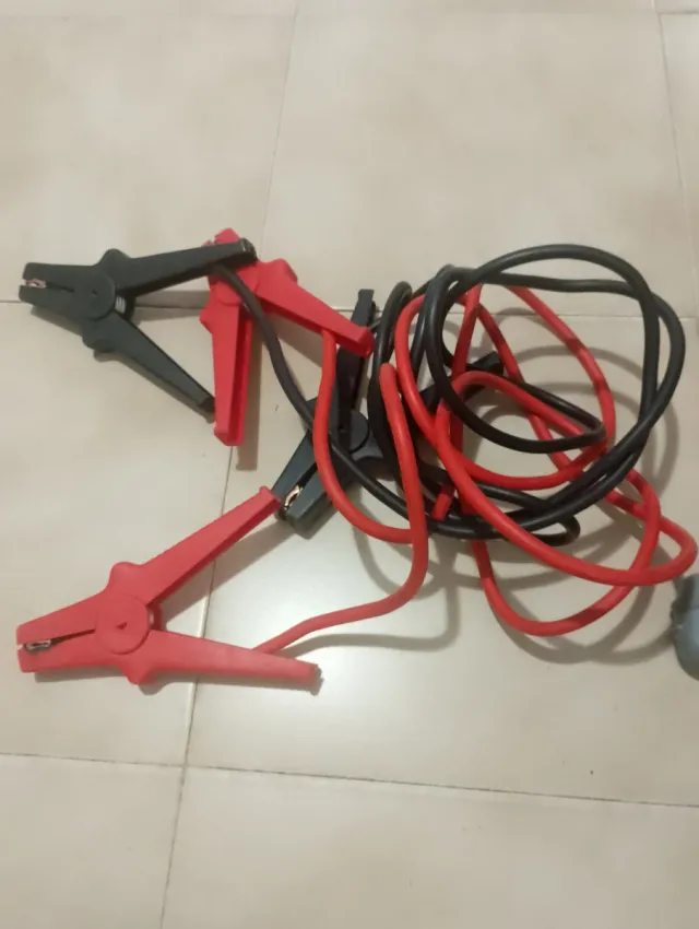 Pinzas de arranque para batería de coche, con cables rojo y negro. - Pinzas de sujeción de plástico rojo y negro. - Cables de conexión de goma roja y negra.