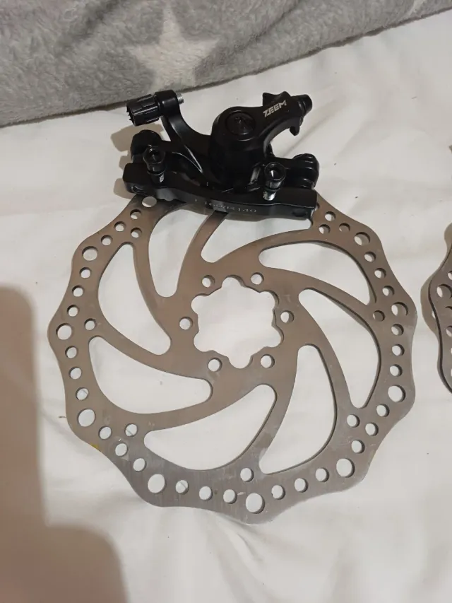 Set de pinzas y discos de freno para bicicleta, nuevos a estrenar. - Pinzas de freno de disco. - Discos de freno de disco.