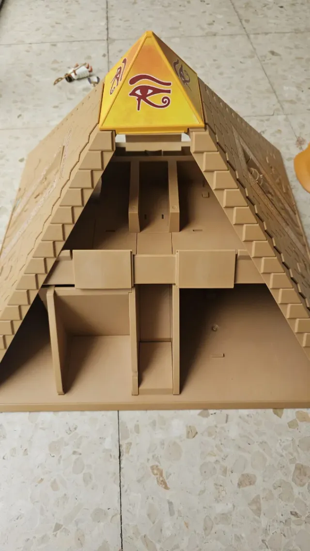 Pirámide de Playmobil con diseño inspirado en el antiguo Egipto. Está en perfecto estado aunque faltan muchas figuras. Contiene la momia, un faraón y una alabarda dorada.