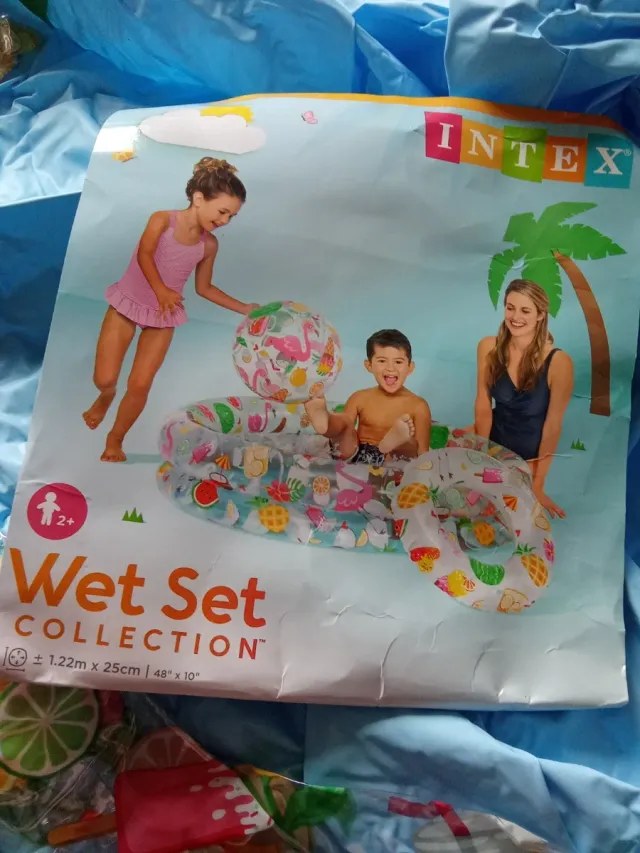 Piscina hinchable Intex Wet Set Collection, ideal para los más pequeños. - Medidas: 1.22m x 25cm (48 x 10). - Diseño divertido con frutas y flamencos. - Apta para mayores de 2 años. - Flotador a juego