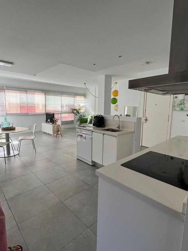 La cocina es moderna y está equipada con todos los electrodomésticos necesarios, incluyendo horno, lavadora, secadora, nevera, microondas y placa de cocina, además de tener un diseño nórdico muy actual e integrado con el salón y las vistas al exterior.