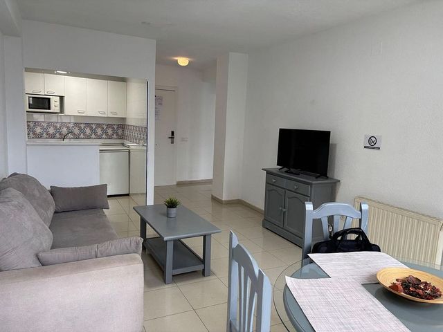 Distribuido en hall de entrada, salón‑comedor con gran ventanal y salida a amplia terraza con agradables vistas a la piscina y zonas ajardinadas. Cocina americana amueblada y equipada con electrodomésticos básicos, dormitorio doble con armario empotrado y acceso directo a la terraza, y baño completo con bañera. Suelos de gres de fácil mantenimiento, carpintería de aluminio y excelente entrada de luz natural. Edificio con piscina comunitaria y zona de solárium.