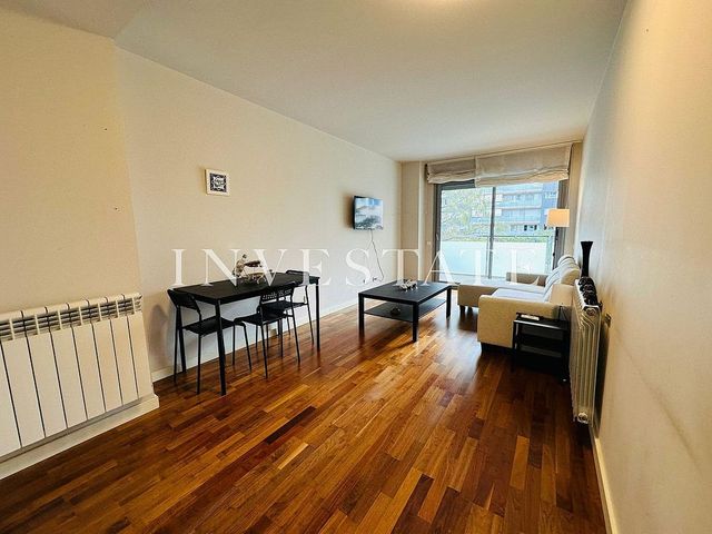La zona de estar está compuesta por un salón-comedor amplio y muy luminoso, equipado con sofá, mueble de TV, mesa de comedor y sillas. Desde esta estancia se accede a una terraza privada con vistas despejadas a un parque interior, lo que aporta tranquilidad y una agradable sensación de apertura, alejada del ruido urbano.