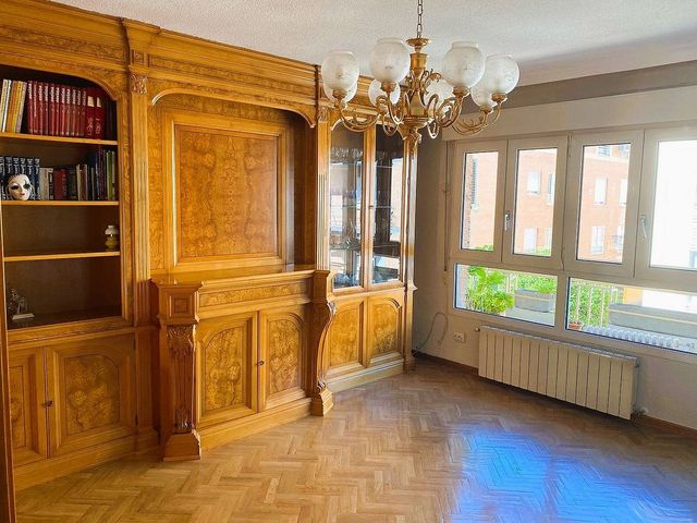 Es un piso que destaca por su luminosidad, amplitud y calidad de sus materiales; tiene suelos de parquet, ventanas de tipo climalit con cierre hermético y apertura oscilobatiente, paredes revestidas de madera en el salón y dos habitaciones con armarios a medida. Incluso el portal se hizo a capricho de los propietarios, es decir, con acabados en mármol y con ascensor grande.