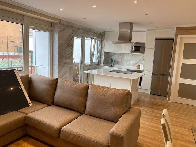 Amplio salón con cocina integrada, completamente equipada con electrodomésticos de alta calidad.