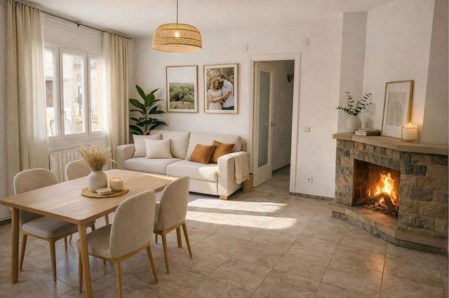 De tornada, ens espera el cor de la llar amb la sala d'estar-menjador. La xemeneia hi és, esperant els dies freds, però també és un punt de trobada, un lloc on la casa pren vida.