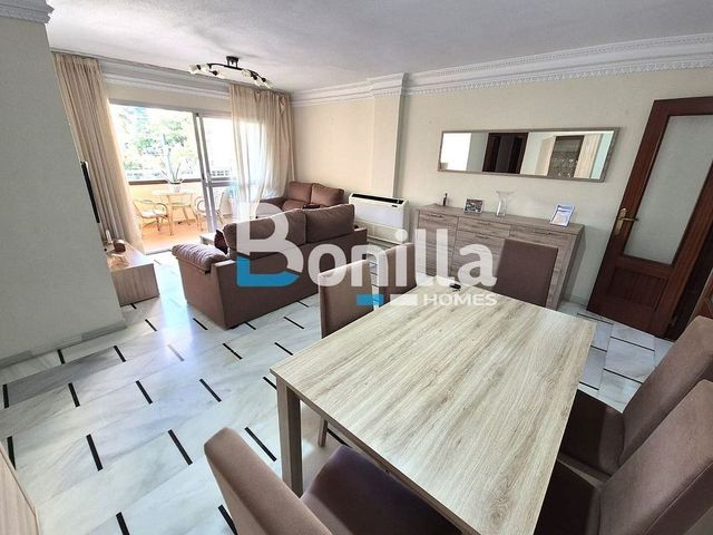 Amplio salón comedor con suelo de mármol y con salida a una terraza ideal para desconectar o disfrutar al aire libre, con vistas al parque Jurado Lorca.