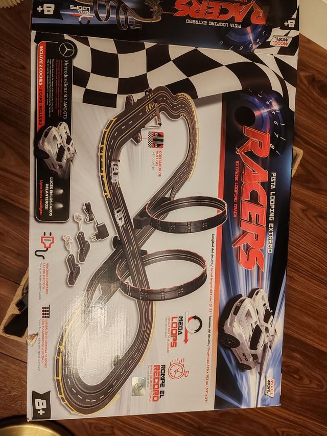 Pista tipo Scalextric con 2 loopings en perfecto estado, sin uso. Con 2 mandos y 1 solo coche.