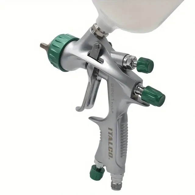 Detalles del productoITALCO, pistola de pintura de alta calidad Shine1 HVLP pistola de pulverización. Pico de 1,3mm, taza de 600cc, para acabado de superficies automotrices.