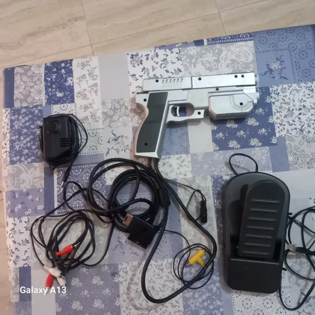 Pistola de luz para PlayStation 1, modelo The Real Arcade. - Incluye pistola, pedal y cables de conexión. - Diseño plateado y negro.