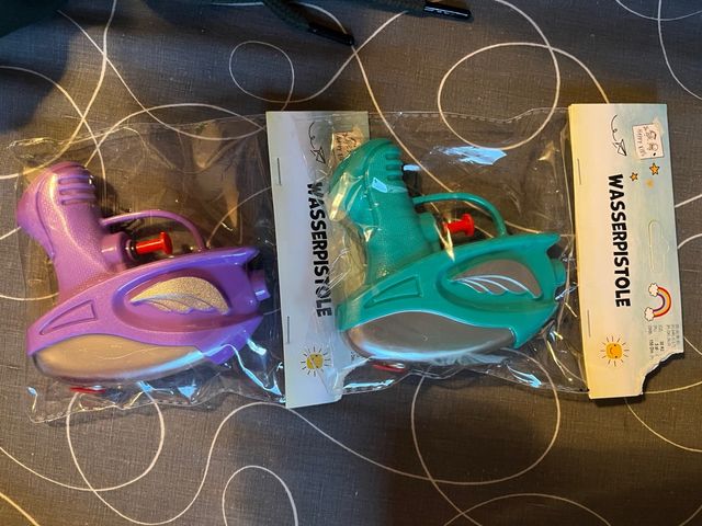 Dos pistolas de agua, una morada y otra verde, perfectas para jugar. - Diseño divertido y colorido. - Empaquetadas individualmente.
