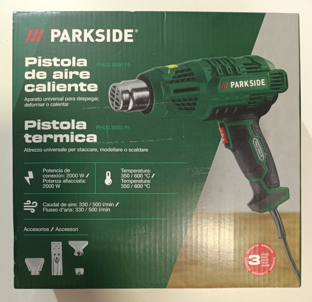 Detalles del productoPistola de aire caliente Parkside, modelo PHLG 2000 F5. Ideal para despegar, deformar o calentar.