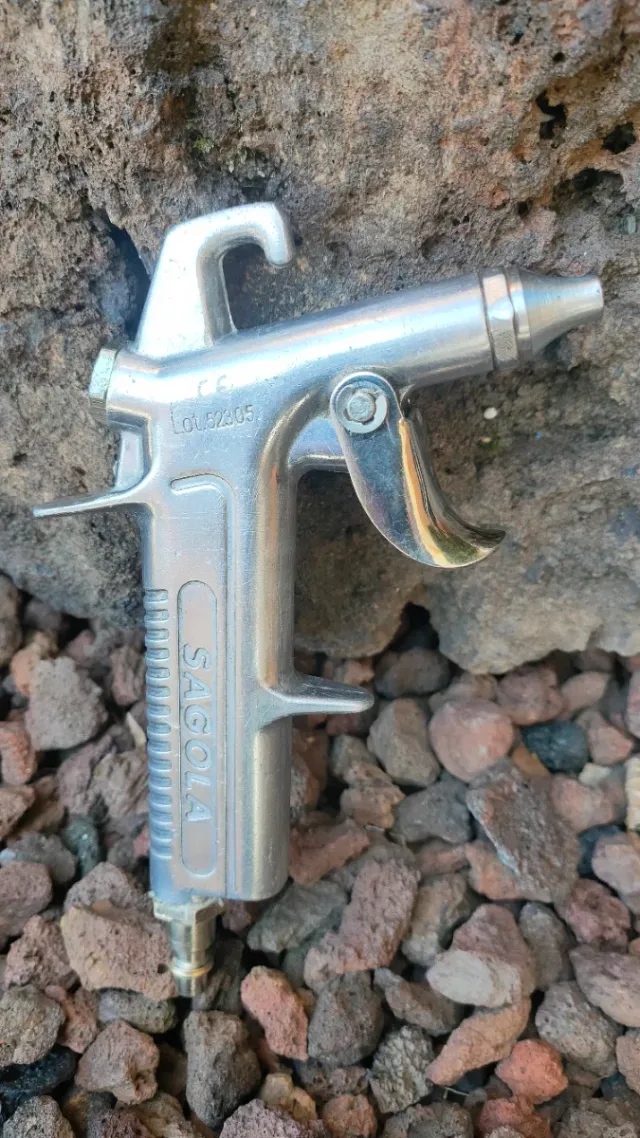 Pistola de aire de la marca Sagola, fabricada en metal plateado. - Modelo con gatillo. - Marca Sagola grabada en el cuerpo. - Marcado CE y número de lote visible.