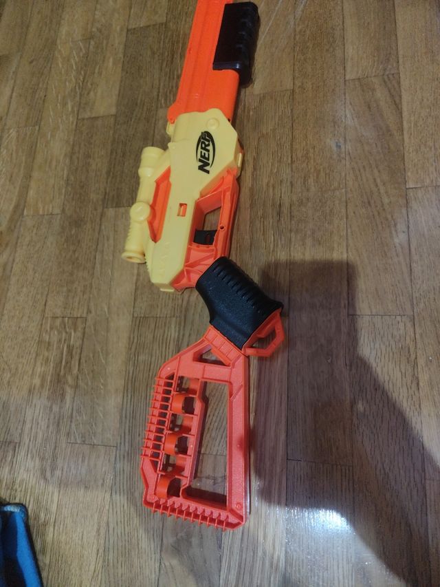 Pistola de dardos de juguete con diseño llamativo. - Color naranja y amarillo. - Marca Nerf.