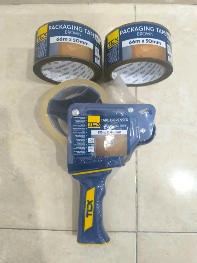 - Dos rollos de cinta de embalaje de color marrón.