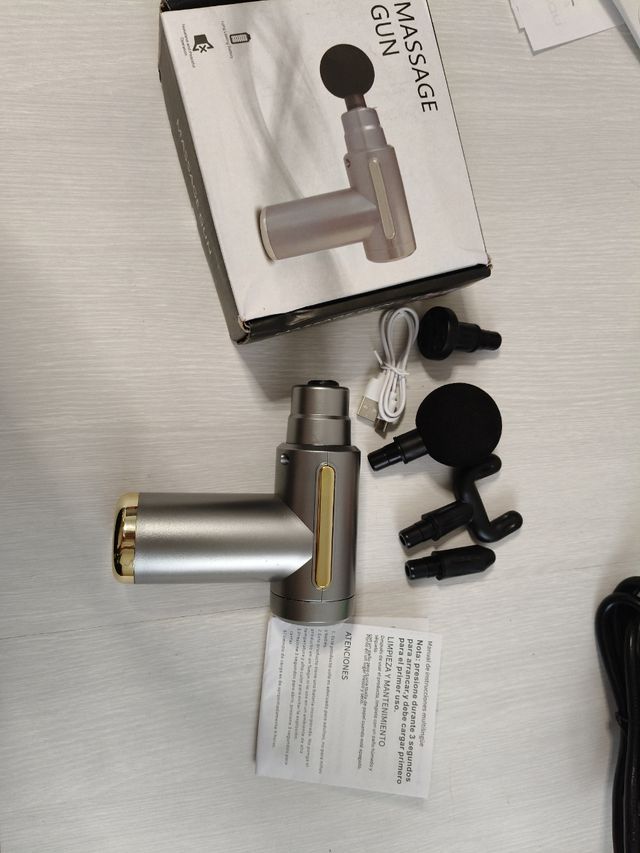 Detalles del productoPistola de masaje prácticamente nueva, en color gris y dorado. Incluye varios cabezales. Masajeador