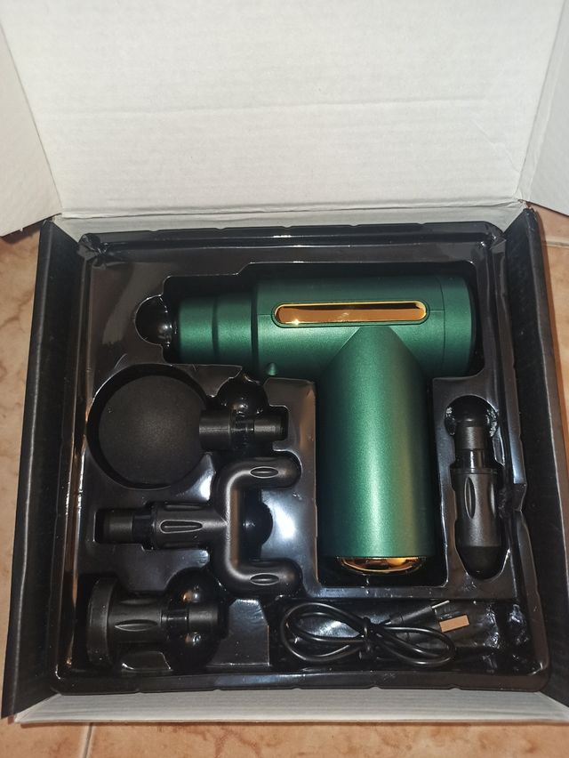Detalles del productoVendo pistola de masaje profesional nueva, recargable y con varios cabezales intercambiables para diferentes áreas del cuerpo. Ideal para aliviar tensión muscular y mejorar la recuperación. Diferentes niveles de intensidad ajustables. Compacta y fácil de usar, incluye cable USB para cargarla. Perfecta para casa, gimnasio o llevar de viaje. Color verde metálico con detalles dorados.