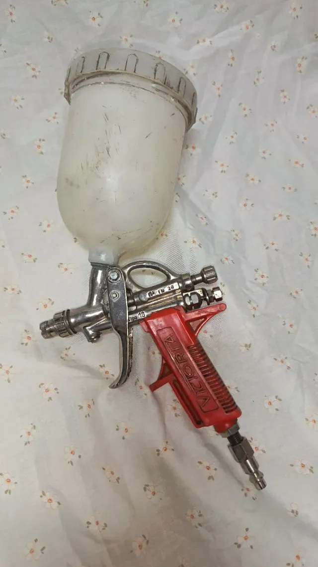 Pistola de pintar con depósito superior,no se hacen envios. - Cuerpo metálico. - Mango de plástico rojo. - Depósito de plástico blanco.