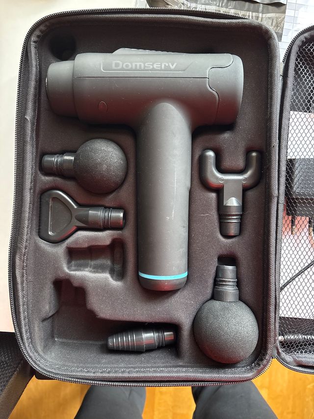 Detalles del productoPistola de masaje de la marca Domserv, ideal para recuperación muscular. Incluye varios cabezales para diferentes zonas del cuerpo.
