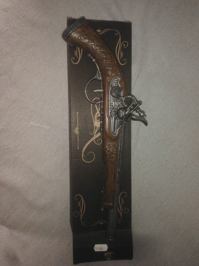 Detalles del productoRéplica de pistola mosquetón de estilo antiguo. Presenta un diseño detallado con acabados que imitan la madera y el metal.