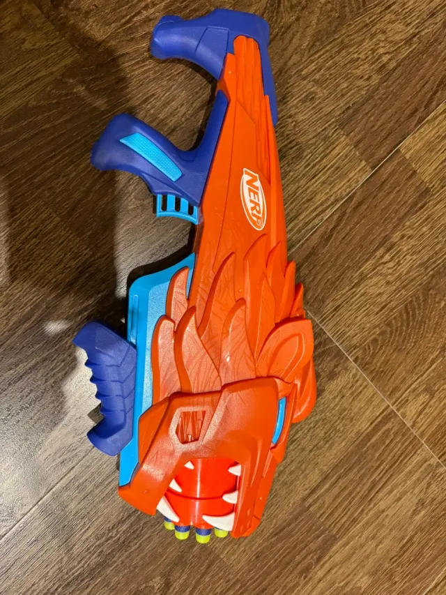 Pistola de juguete Nerf con diseño de dragón. - Color naranja y azul. - Incluye varias balas de espuma.