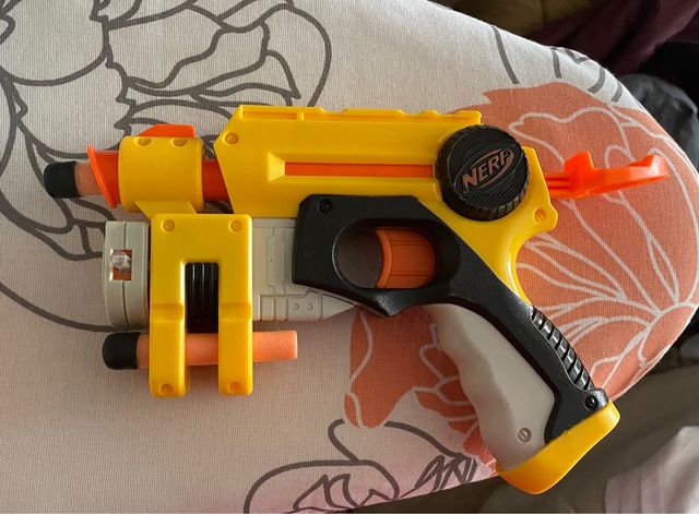 Pistola nerf en buen estado. Incluye 3 dardos. Tiene una mira láser que funciona a pilas. Hago envíos.