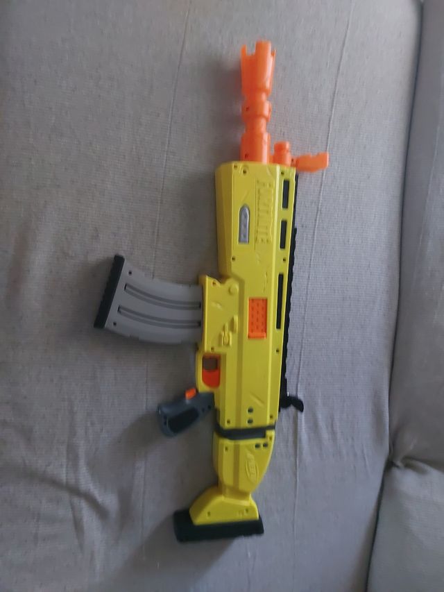 Pistola de juguete Nerf inspirada en Fortnite, color amarillo. - Diseño llamativo. - Incluye cargador. -no incluye municion