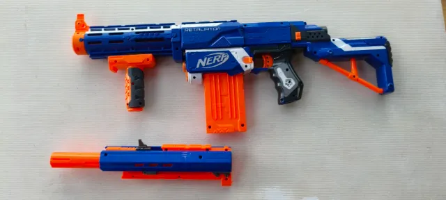 Detalles del productoPistola de juguete Nerf Retaliator en llamativos colores azul y naranja. Ideal para juegos de acción.